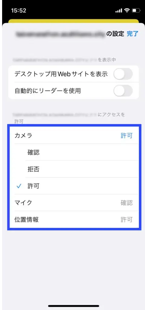 2 「カメラ」を開き、許可にチェックしてください。これで、カメラの利用が可能になります。変更後、ブラウザをリロードし、もう一度スタンプの獲得をしてみてください。