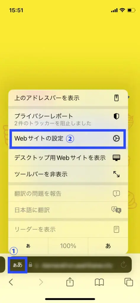 1.ウェブサイトを開いた状態で、URLを入力する部分の一番左にある①の「ぁあ」を押し、②の「Webサイトの設定」を選択します。